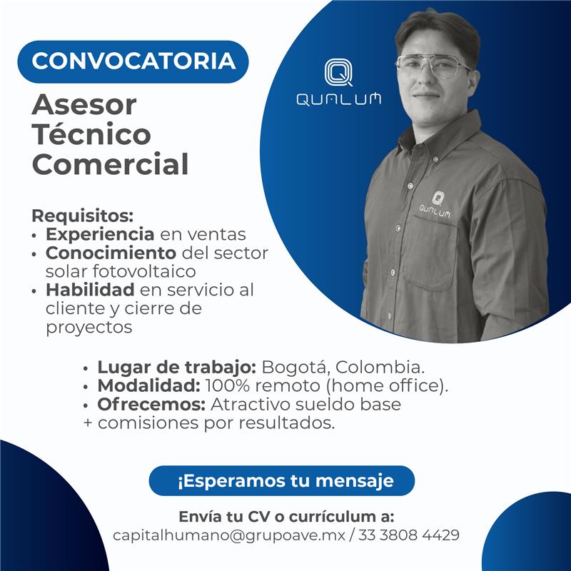 En QUALUM, marca especializada en diseño y fabricación de estructuras de montaje para sistemas fotovoltaicos, estamos en plena expansión en Colombia y buscamos un Asesor Técnico Comercial que quiera liderar el desarrollo del mercado y consolidar relaciones estratégicas en el sector solar.